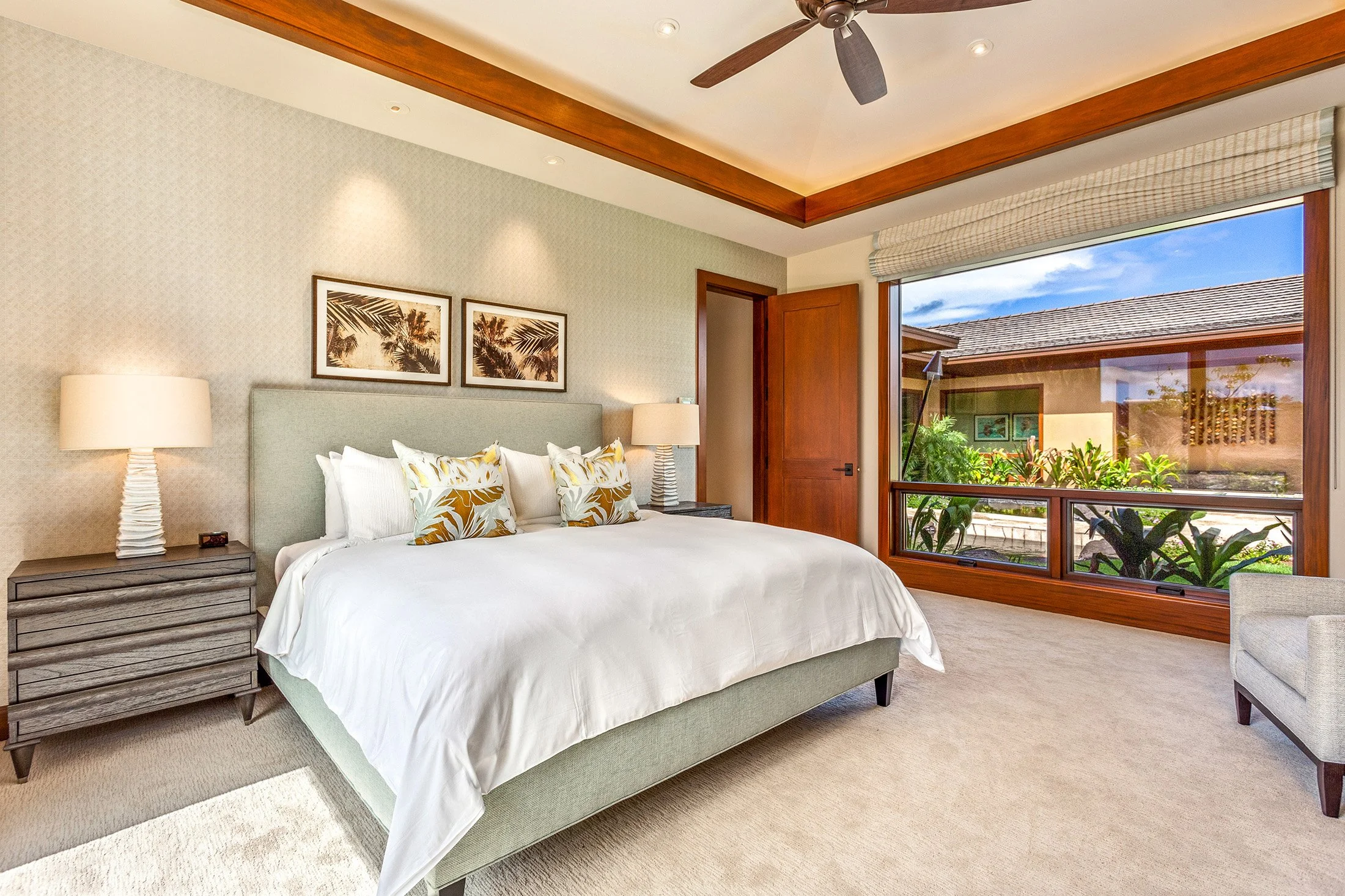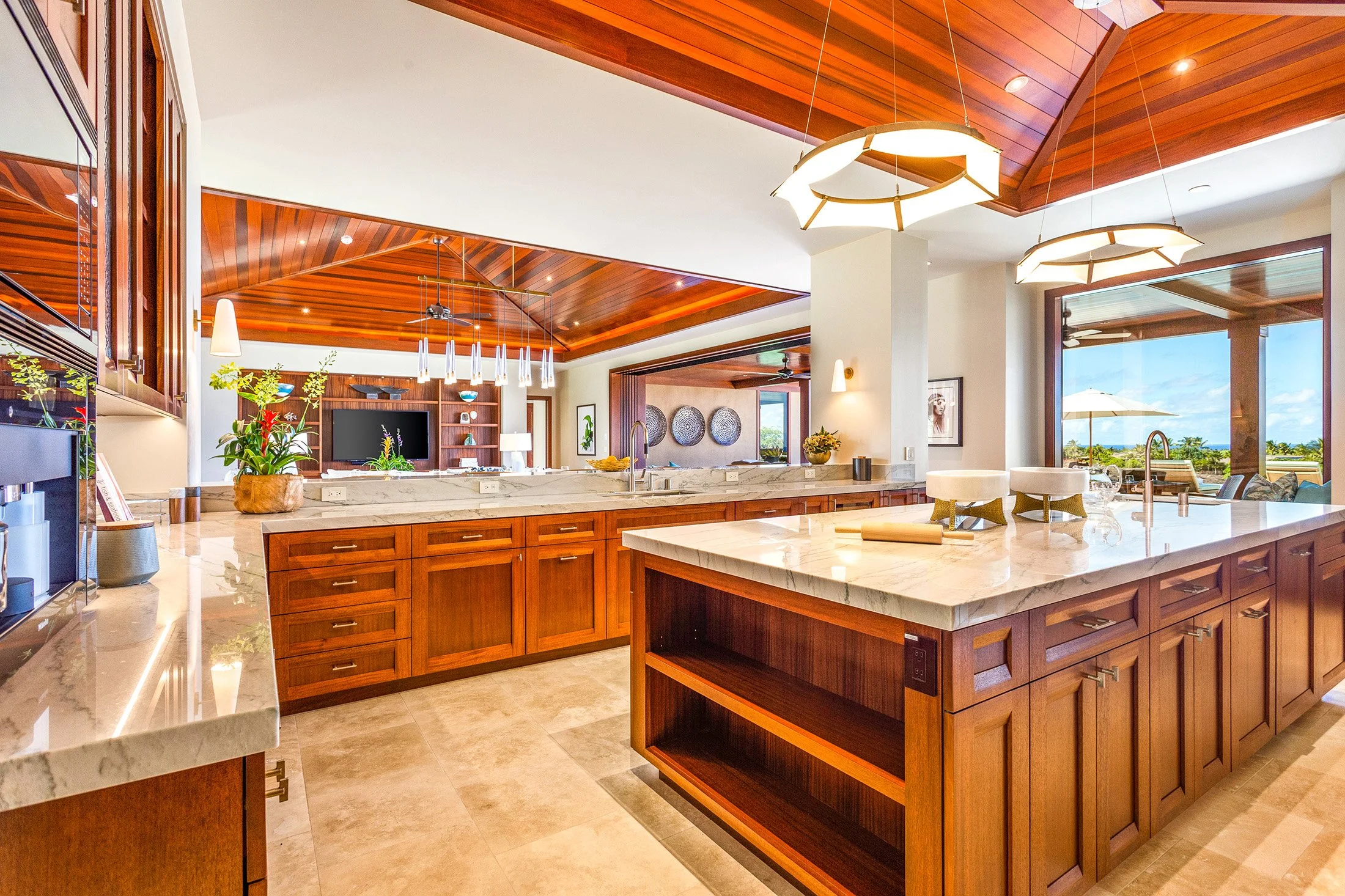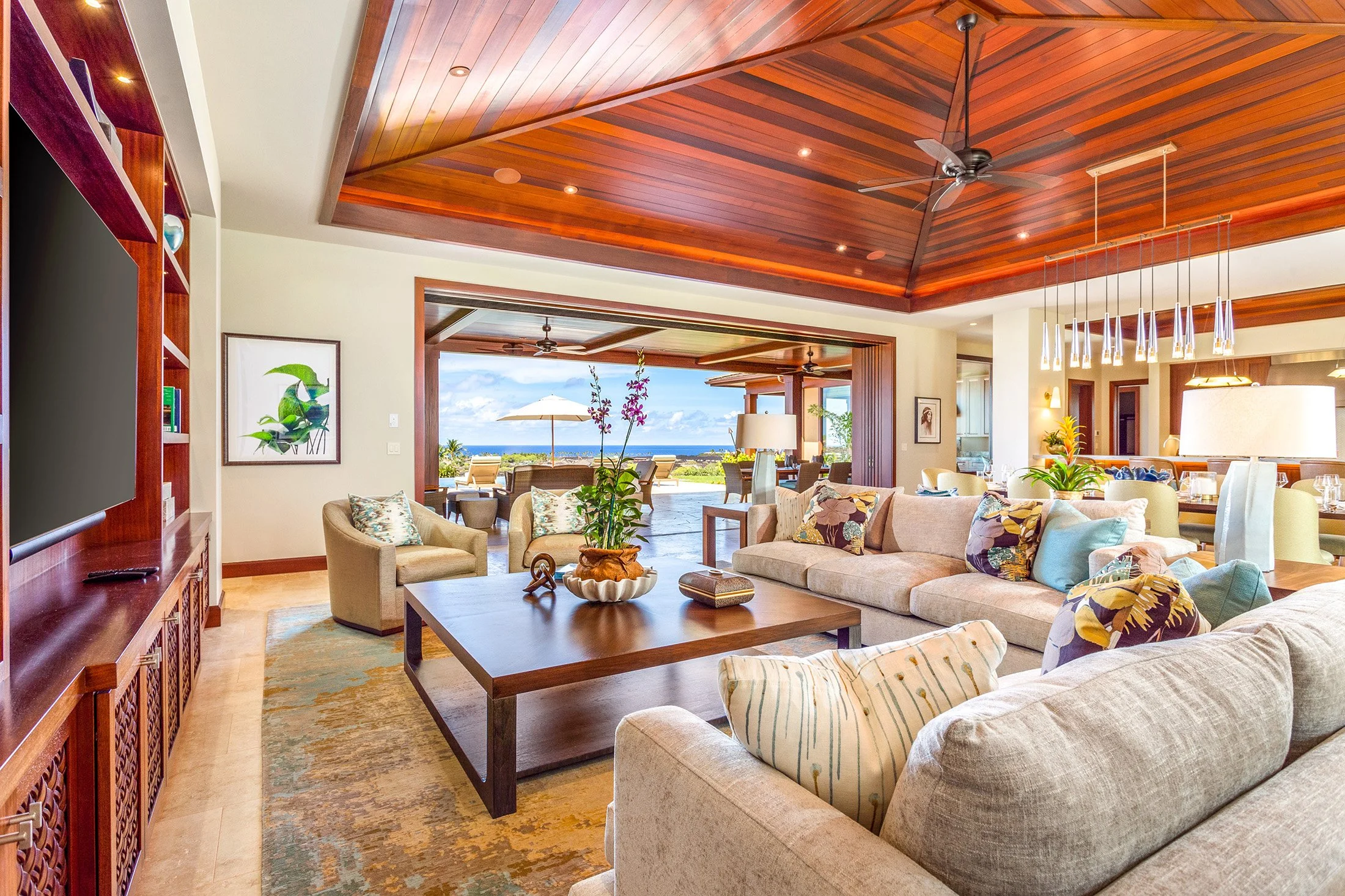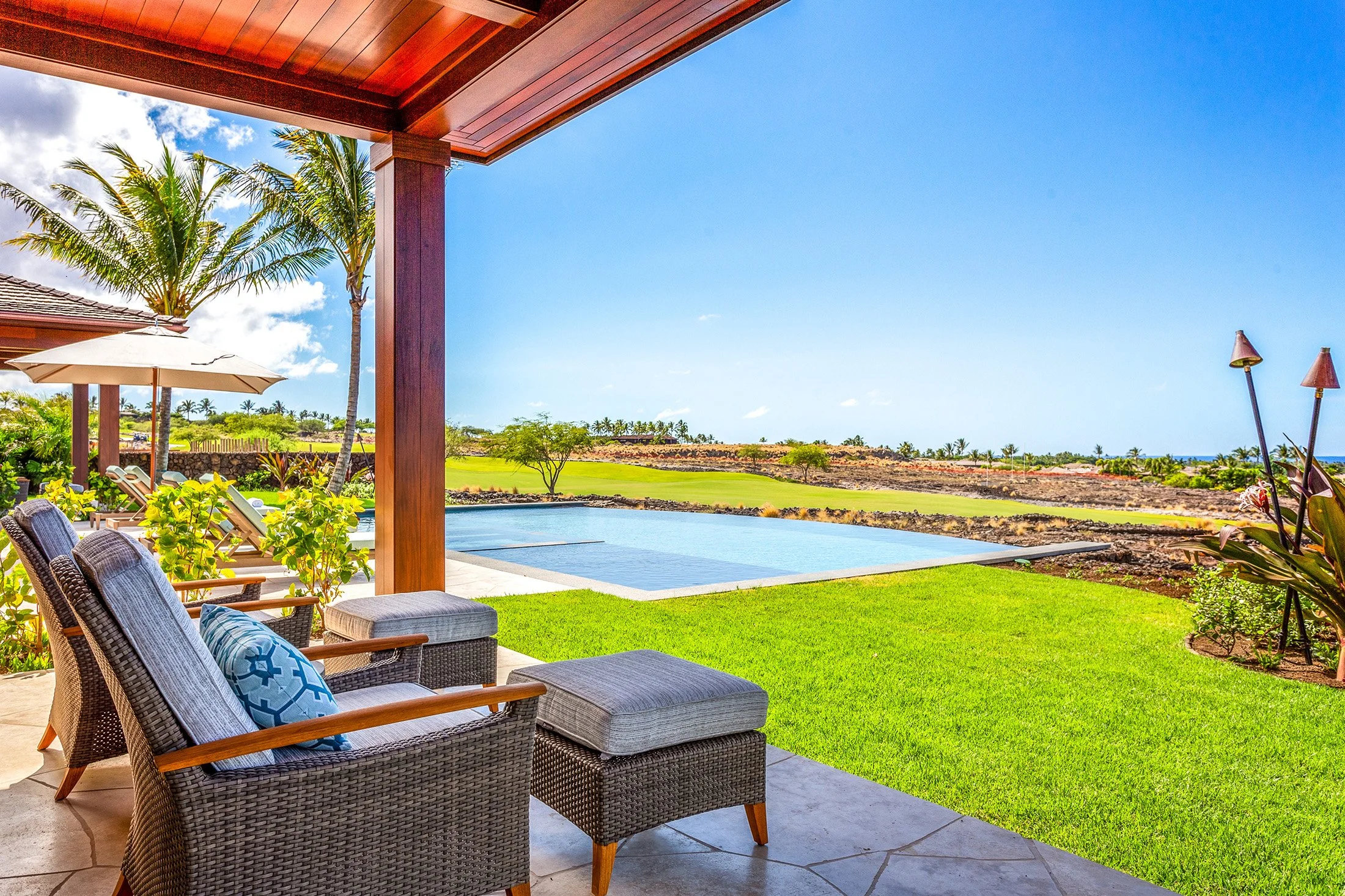 Located in Pi’iuka Estates, our newest residential community, this custom residence offers dramatic views of the 14th fairway of the Ke‘olu Golf Course with panoramic vistas of the Pacific Ocean, Hualalai Mountain, Maui, and sunsets. Enjoy outdoor living with a covered lānai that leads out to a built-in barbecue and dining area, ideal for relaxing poolside and enjoying the island’s cool breeze. Additional outdoor amenities include large lawn areas and a covered private lānai for dual primary bedroom suites.