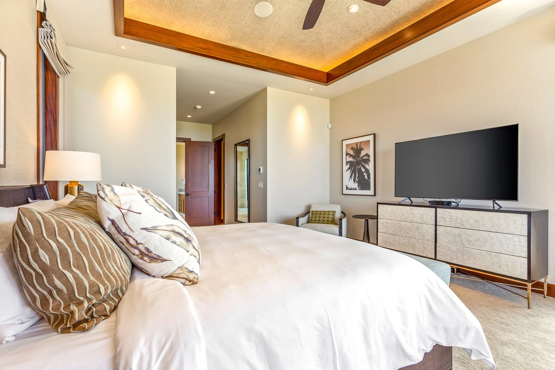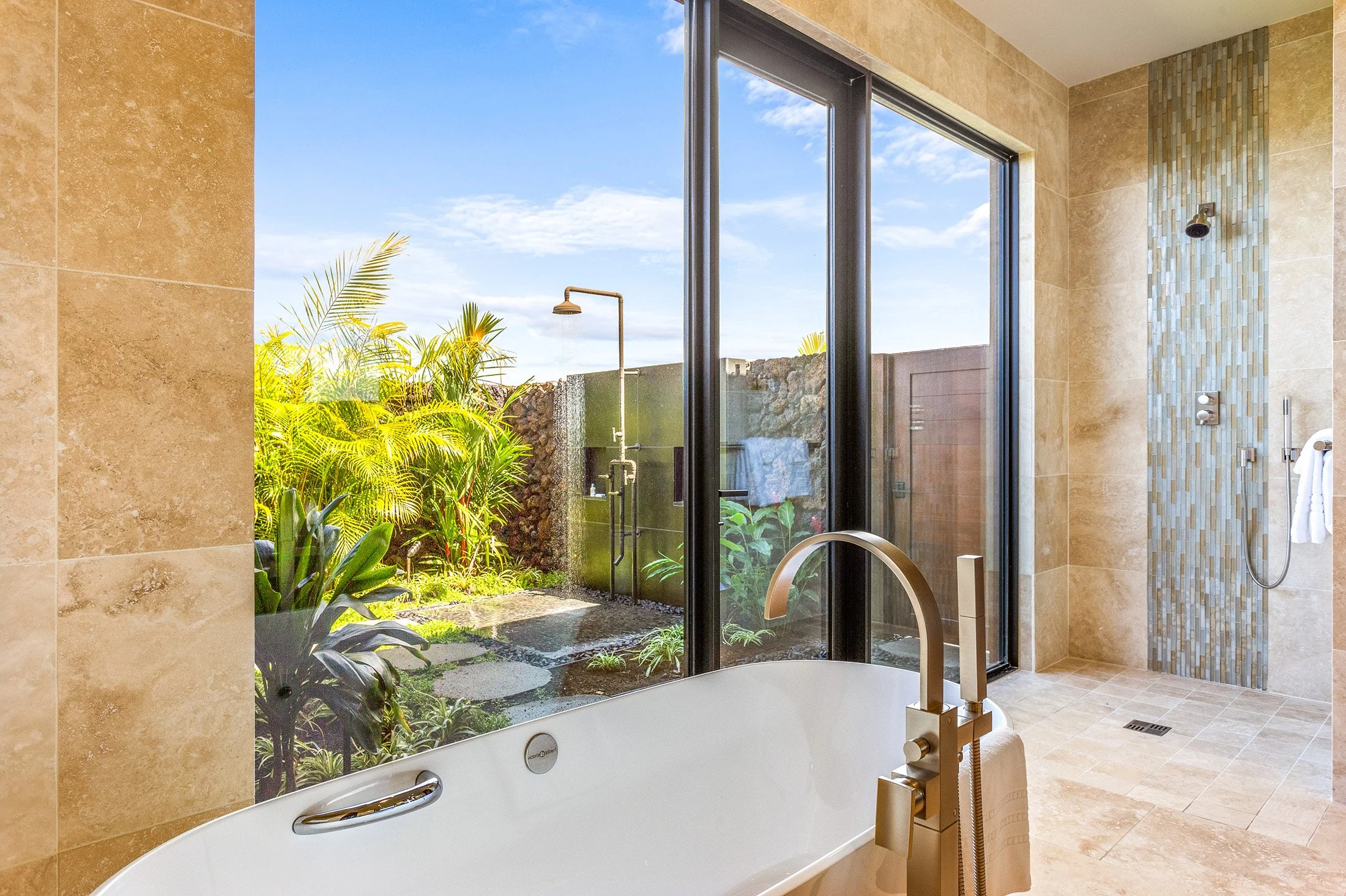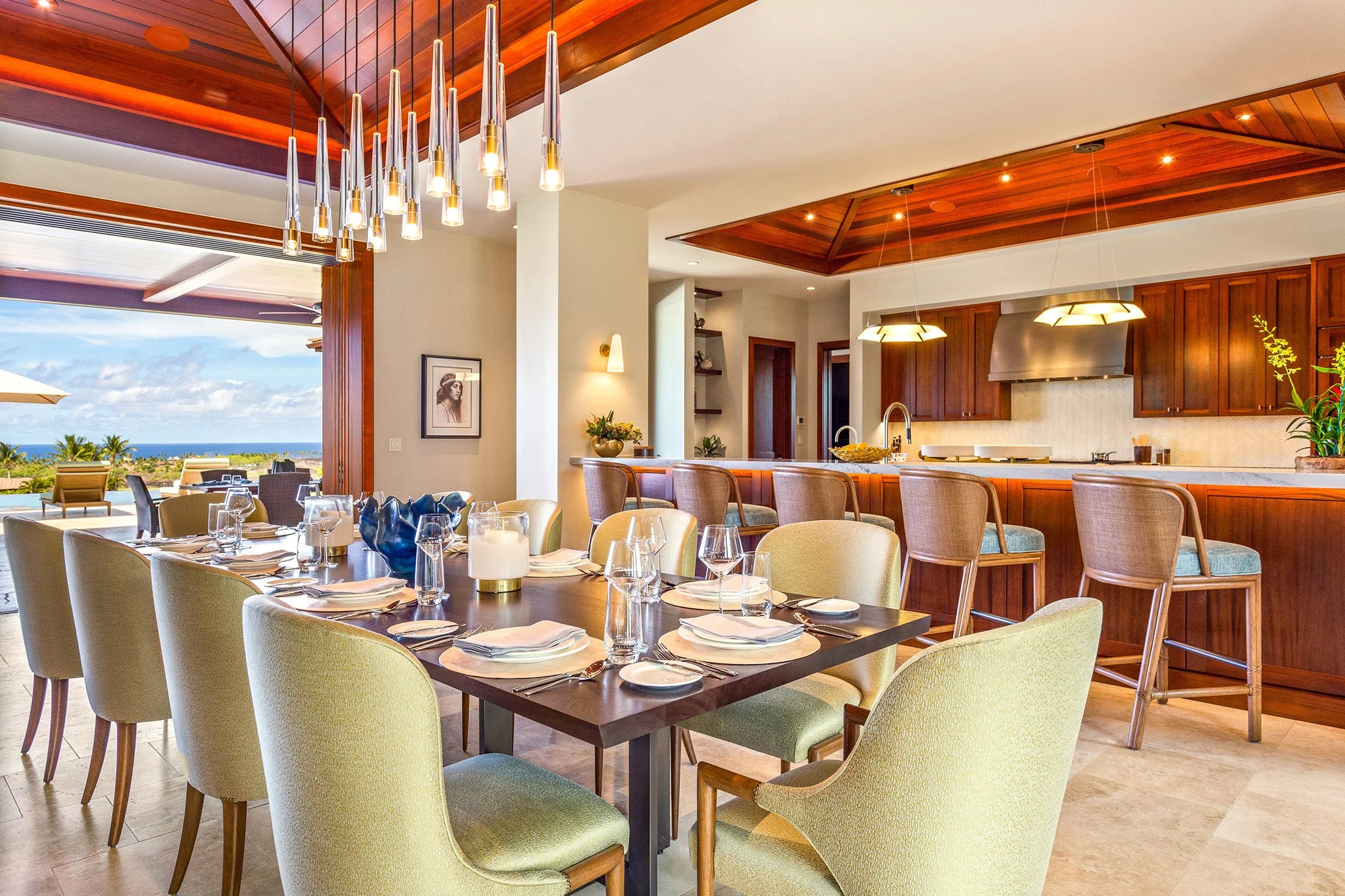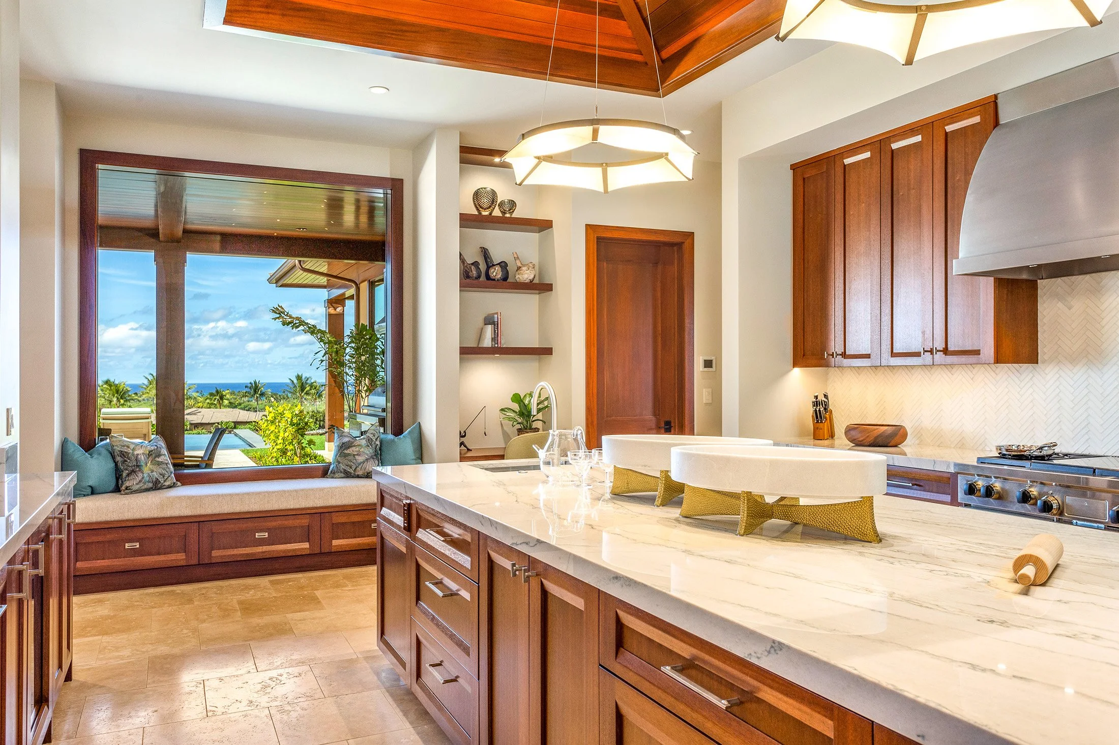 Located in Pi’iuka Estates, our newest residential community, this custom residence offers dramatic views of the 14th fairway of the Ke‘olu Golf Course with panoramic vistas of the Pacific Ocean, Hualalai Mountain, Maui, and sunsets. Enjoy outdoor living with a covered lānai that leads out to a built-in barbecue and dining area, ideal for relaxing poolside and enjoying the island’s cool breeze. Additional outdoor amenities include large lawn areas and a covered private lānai for dual primary bedroom suites.