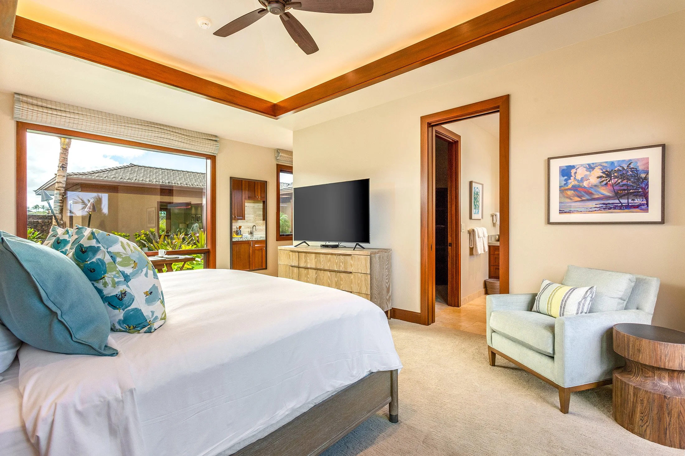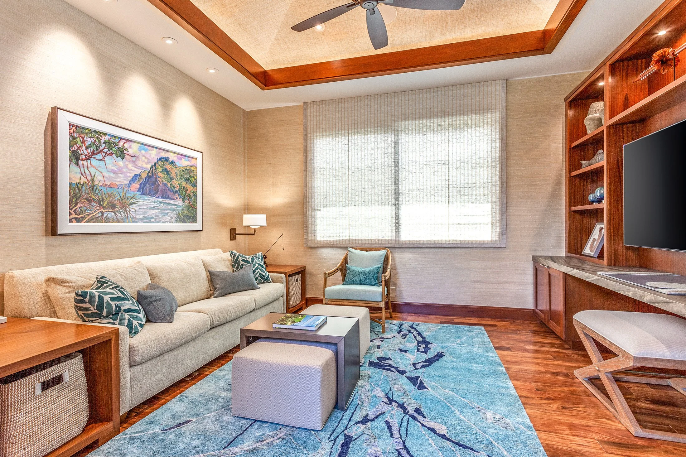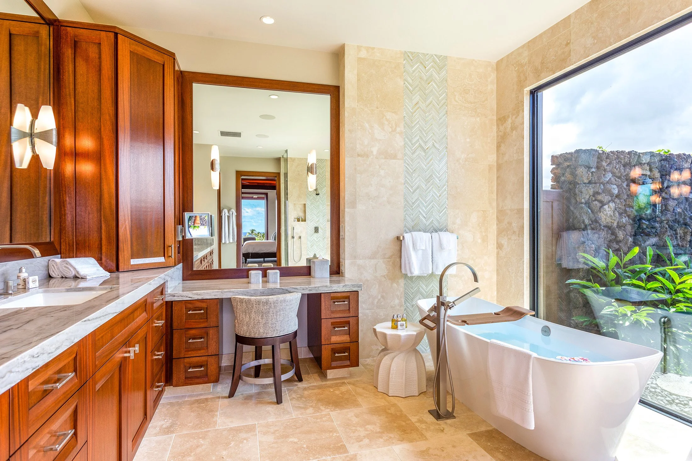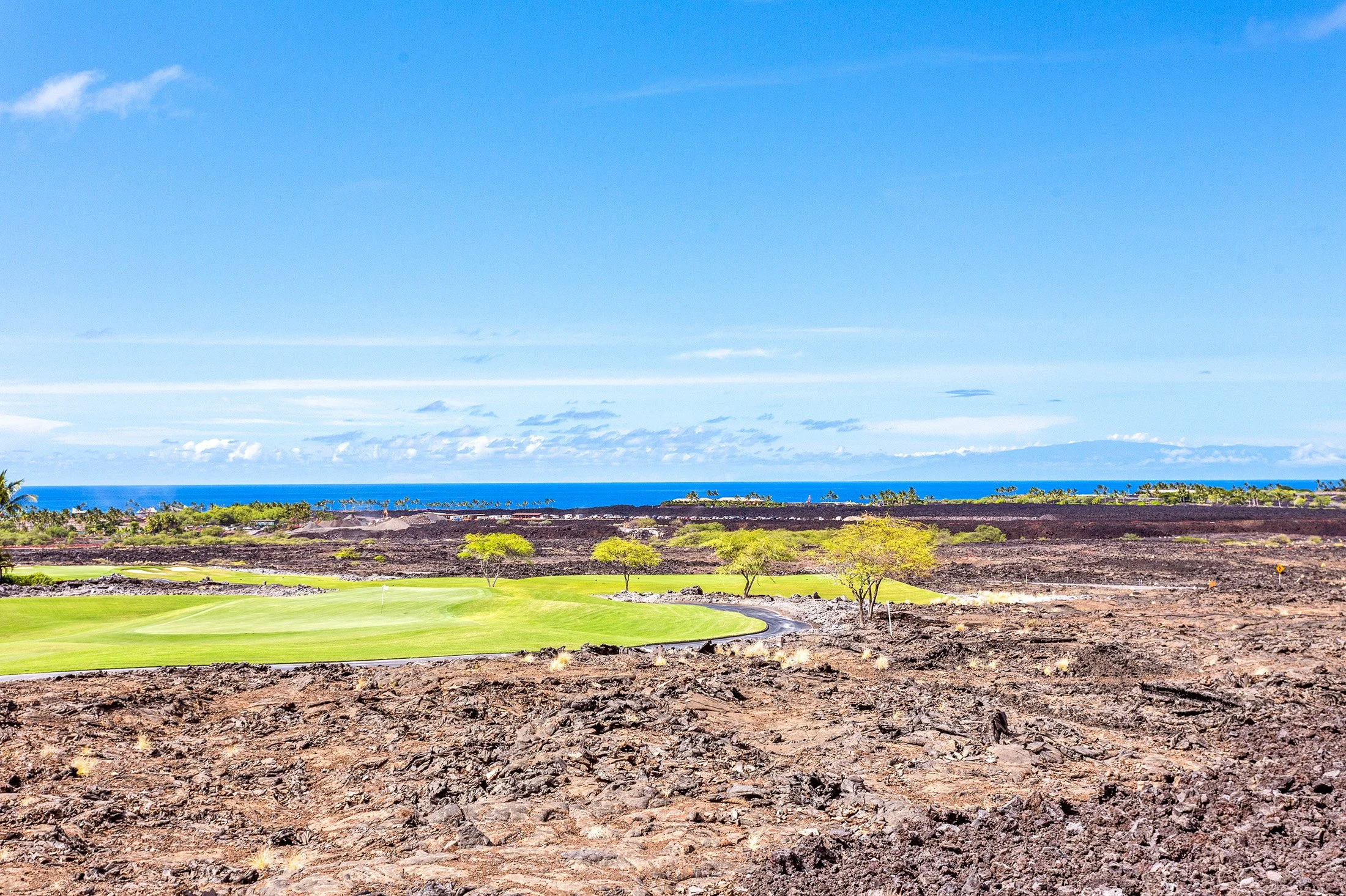 Located in Pi’iuka Estates, our newest residential community, this custom residence offers dramatic views of the 14th fairway of the Ke‘olu Golf Course with panoramic vistas of the Pacific Ocean, Hualalai Mountain, Maui, and sunsets. Enjoy outdoor living with a covered lānai that leads out to a built-in barbecue and dining area, ideal for relaxing poolside and enjoying the island’s cool breeze. Additional outdoor amenities include large lawn areas and a covered private lānai for dual primary bedroom suites.