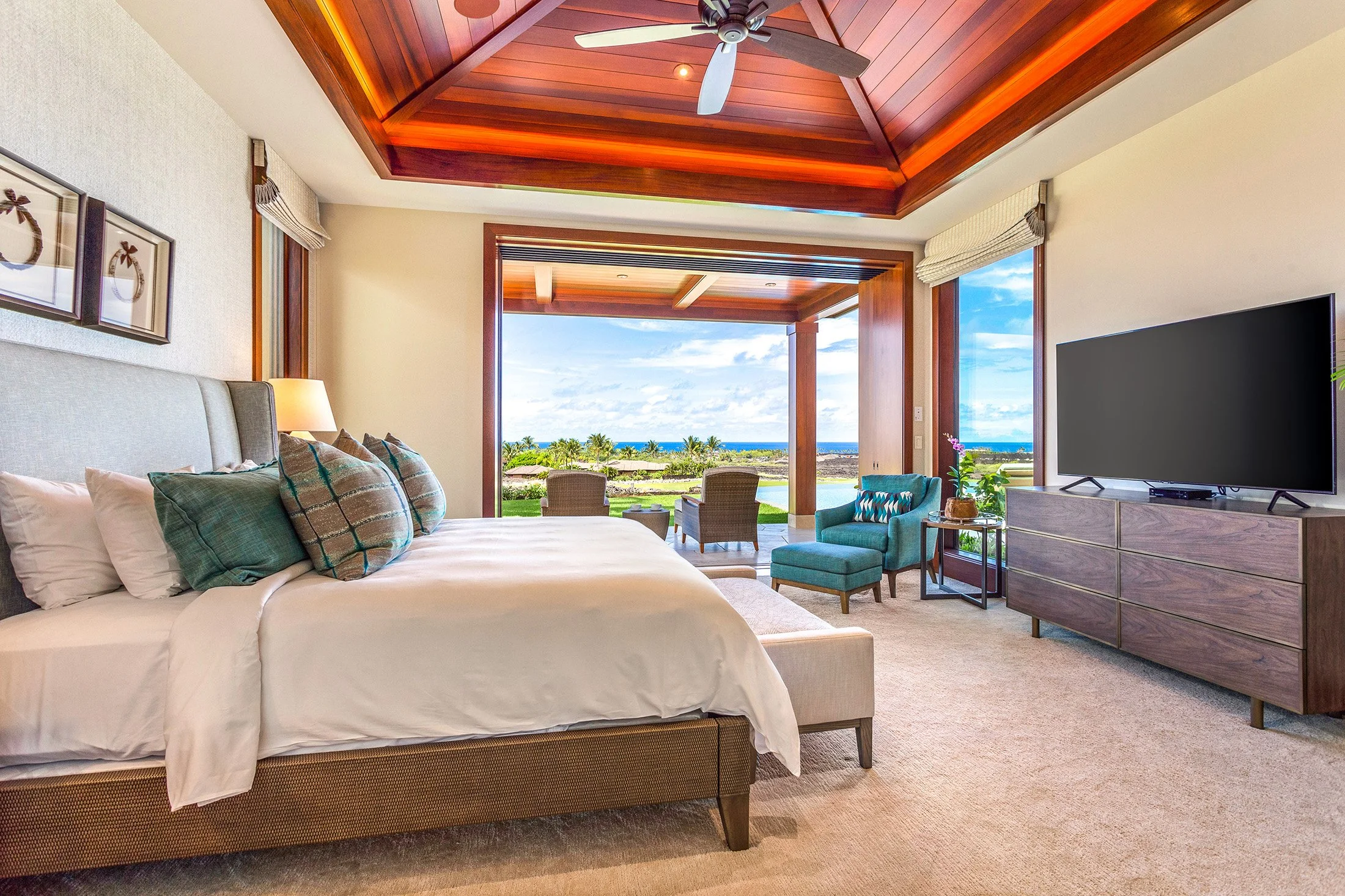 The exquisite primary bedroom with stunning ocean views is steps away from the infinity-edge pool.