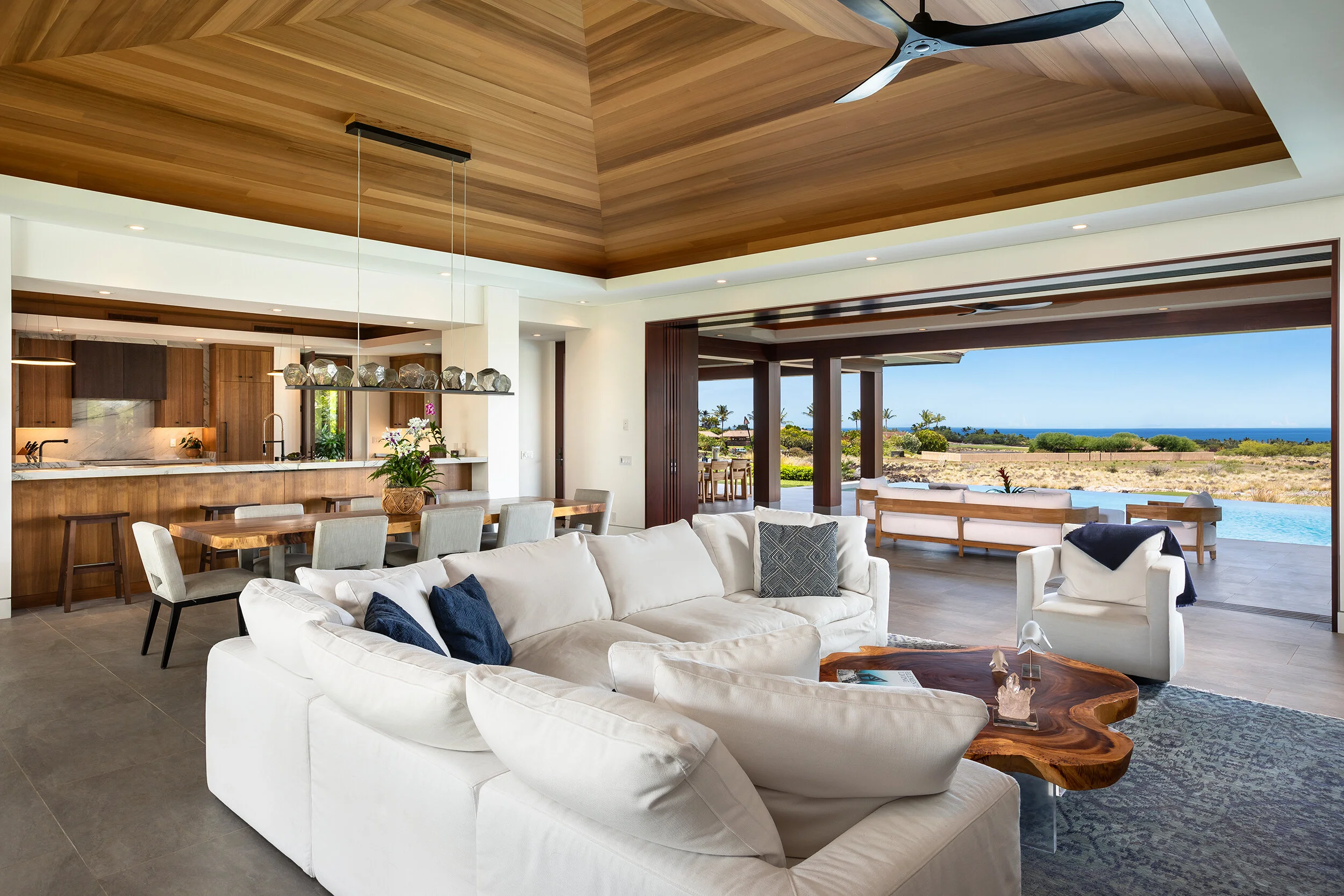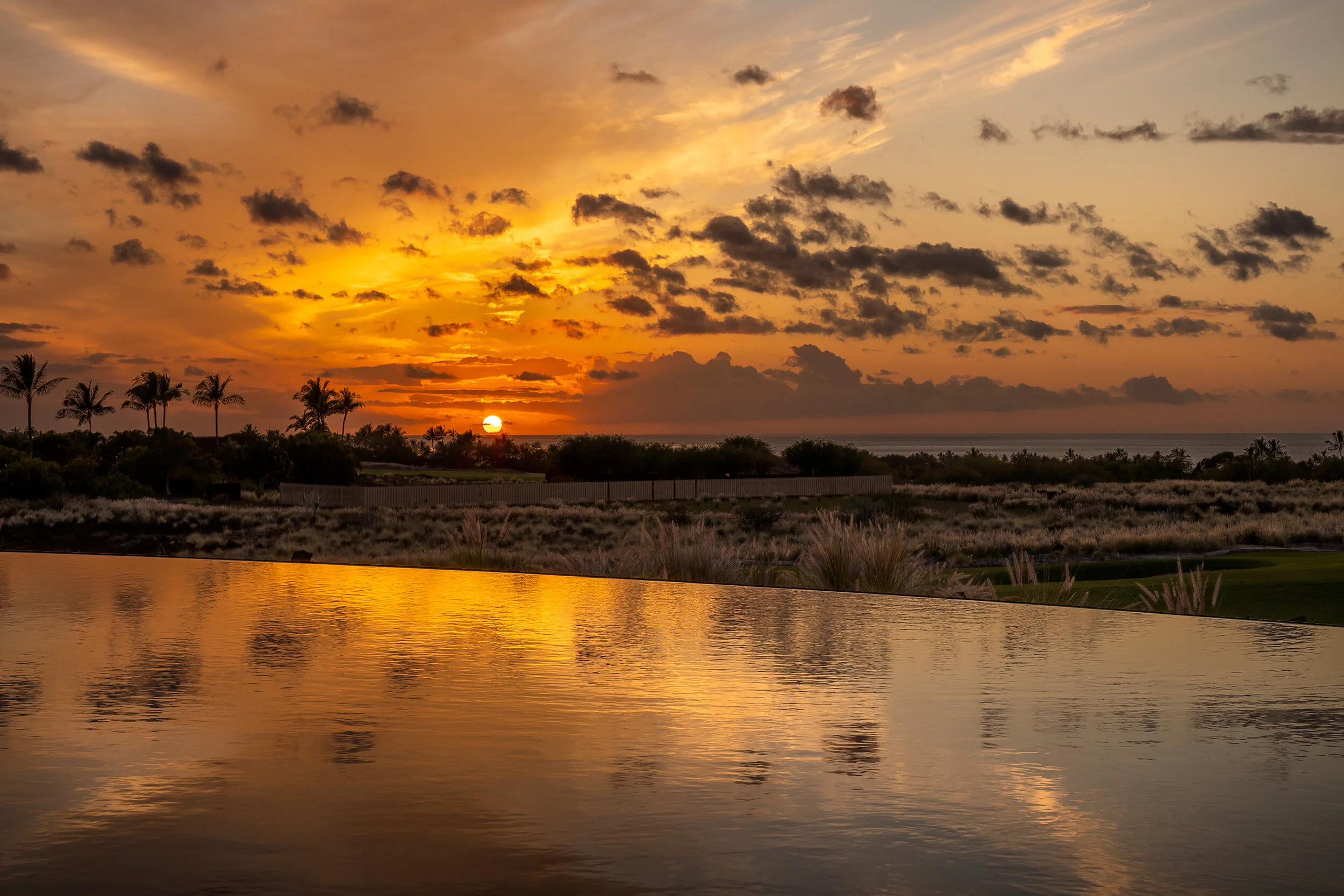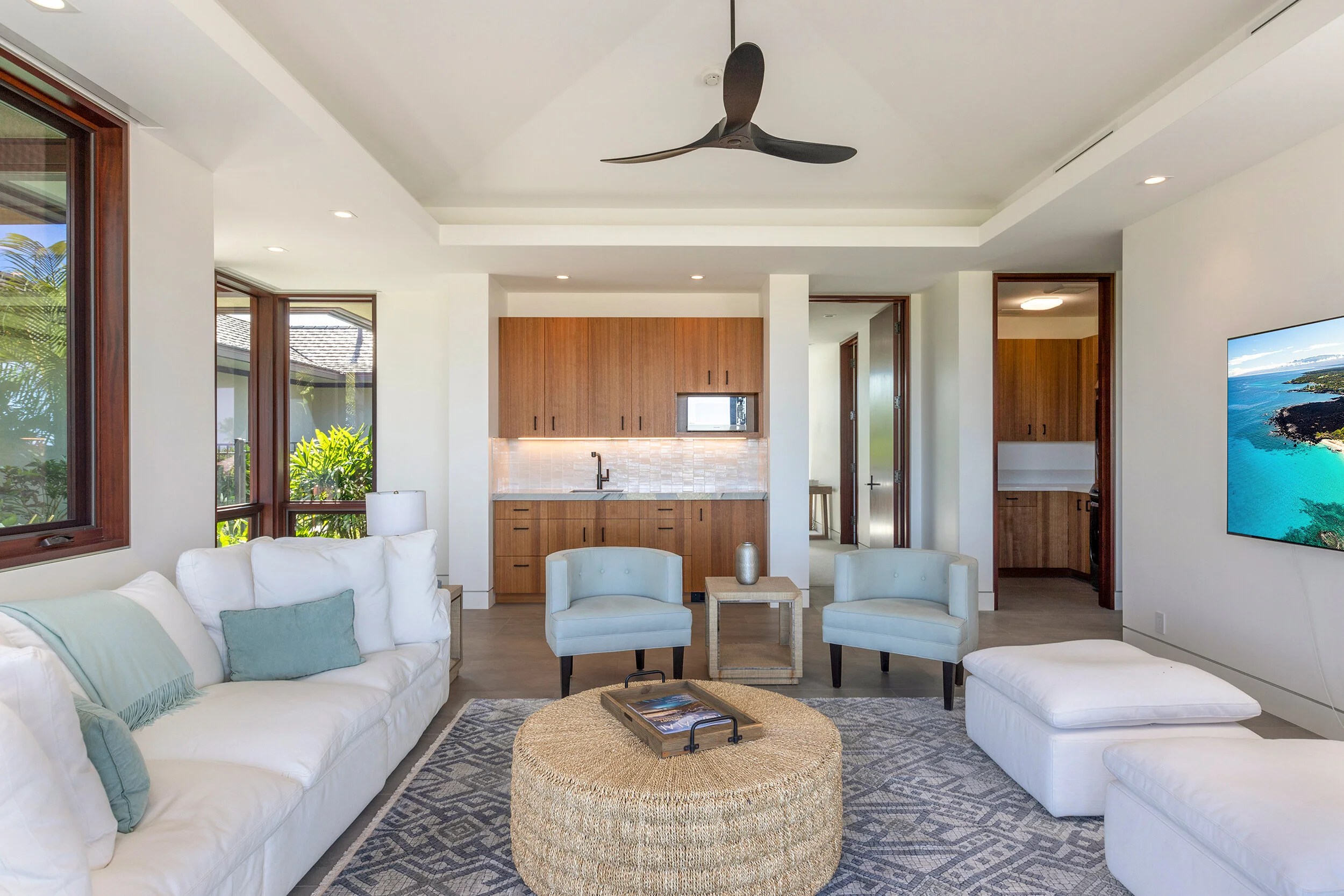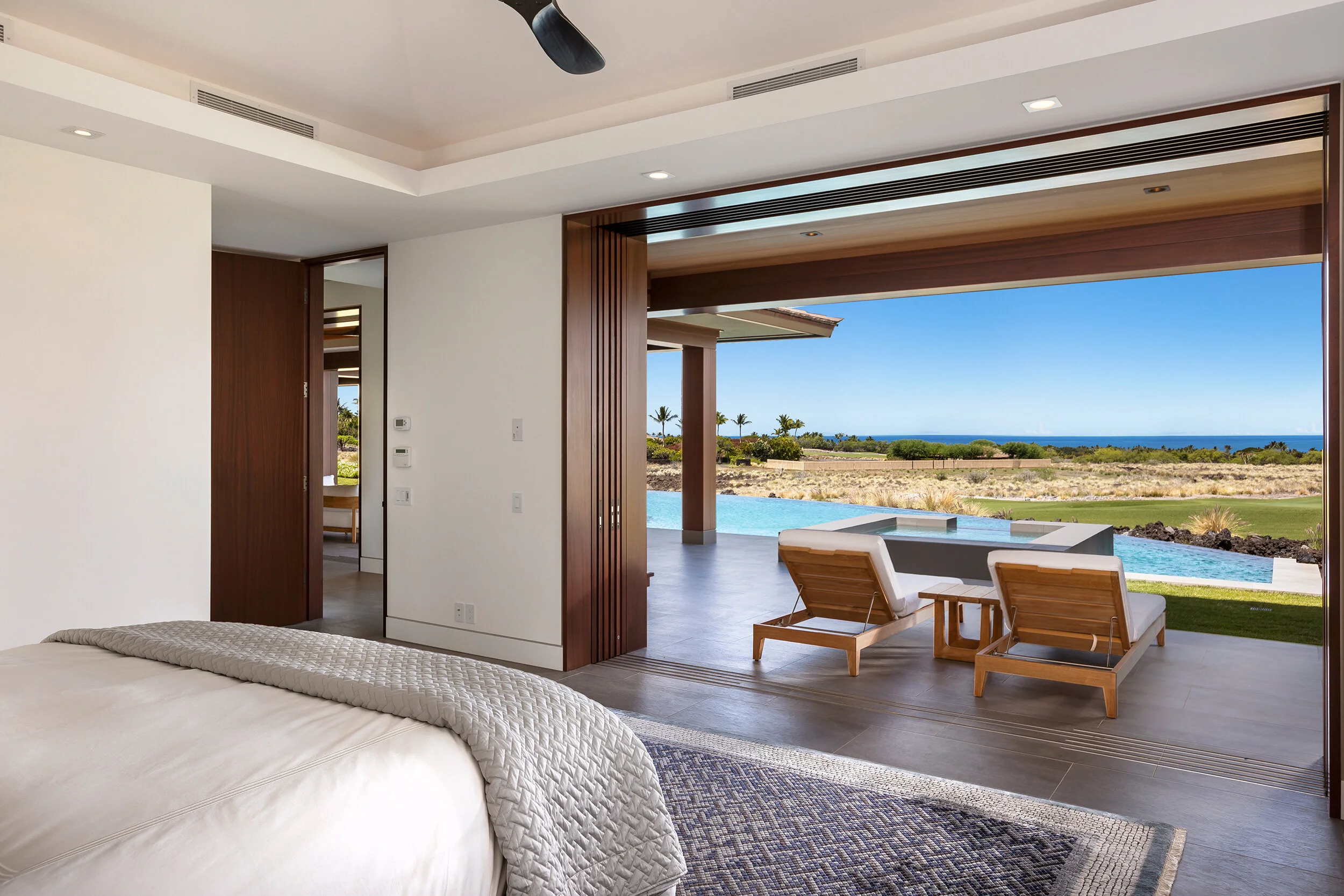 Stunning new contemporary residence overlooking the 11th hole of the private Ke’olu Golf Course with expansive views of the Pacific Ocean, on one of the widest lots at Hualalai. Built by Aina Ola with finishes selected by Willman Interiors. Both the main 3-bedroom home and the large adjacent 2-bedroom guest house are ocean facing, on a beautifully landscaped 1.1 acre lot. The striking large pivot glass front door showcases the exceptional views as one enters the home. The great room and large modern kitchen both have craftsman built cedar coved ceilings, the kitchen has Wolf appliances, sleek modern cabinets and extensive quartzite countertops. All bedrooms have lush outdoor shower gardens, and exceptional contemporary bathrooms. The guest house has its own living room and laundry room.