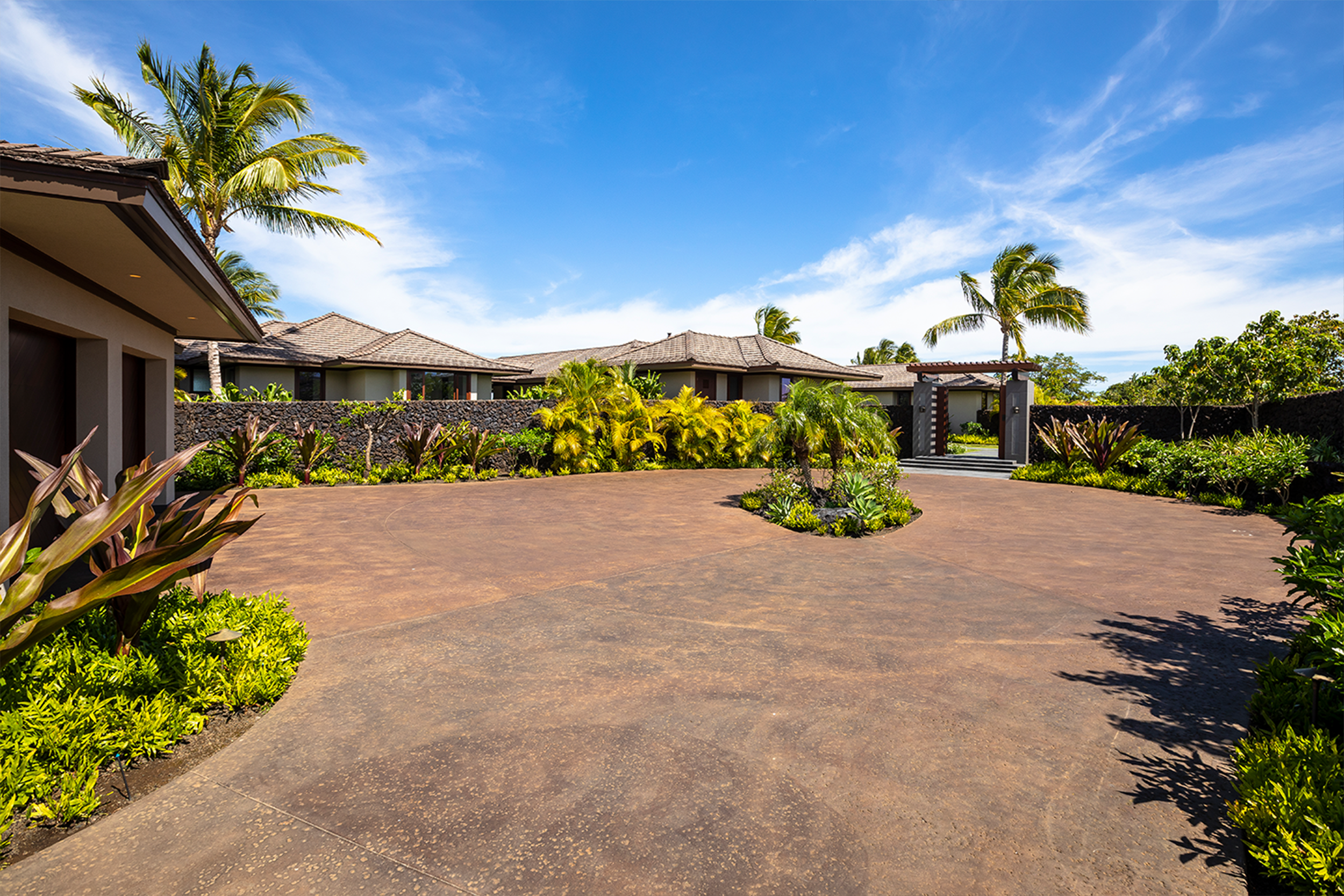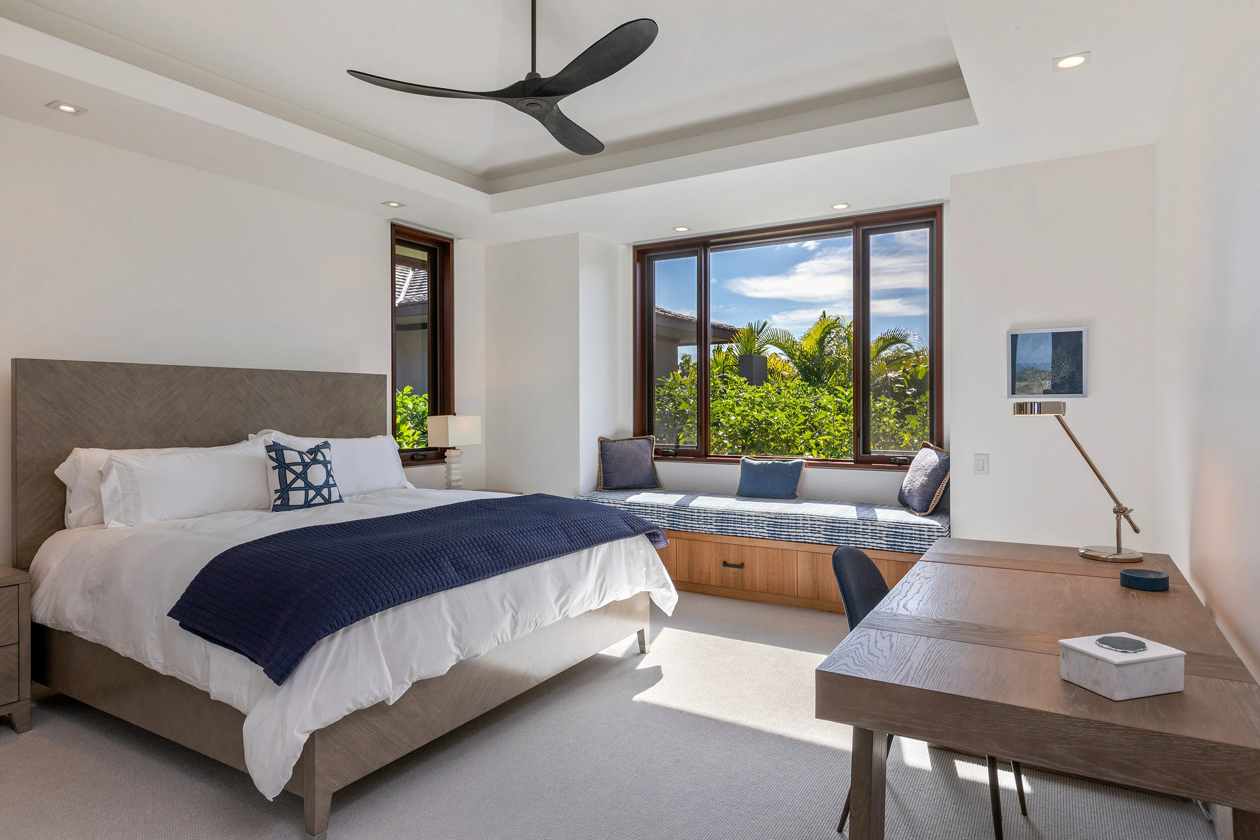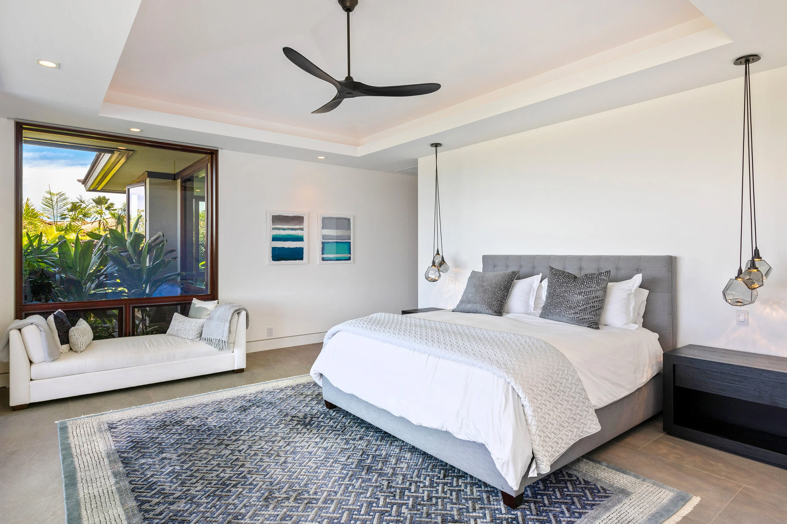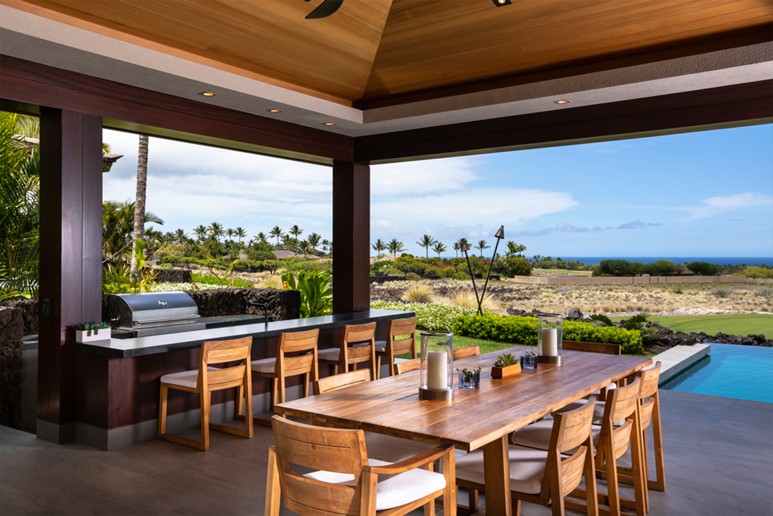 Stunning new contemporary residence overlooking the 11th hole of the private Ke’olu Golf Course with expansive views of the Pacific Ocean, on one of the widest lots at Hualalai. Built by Aina Ola with finishes selected by Willman Interiors. Both the main 3-bedroom home and the large adjacent 2-bedroom guest house are ocean facing, on a beautifully landscaped 1.1 acre lot. The striking large pivot glass front door showcases the exceptional views as one enters the home. The great room and large modern kitchen both have craftsman built cedar coved ceilings, the kitchen has Wolf appliances, sleek modern cabinets and extensive quartzite countertops. All bedrooms have lush outdoor shower gardens, and exceptional contemporary bathrooms. The guest house has its own living room and laundry room.